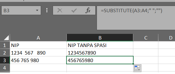 Saya pernah mendapat tugas untuk melakukan export dan import data NIP pegawai dimana ada beberapa yang menulis NIP dengan spasi sehingga proses import data tidak berhasil, lalu saya mencari cara bagaimana menghilangkan spasi pada data NIP yang telah dibuat setelah googling kesana kesini saya menemukan caranya yaitu sebagai berikut: